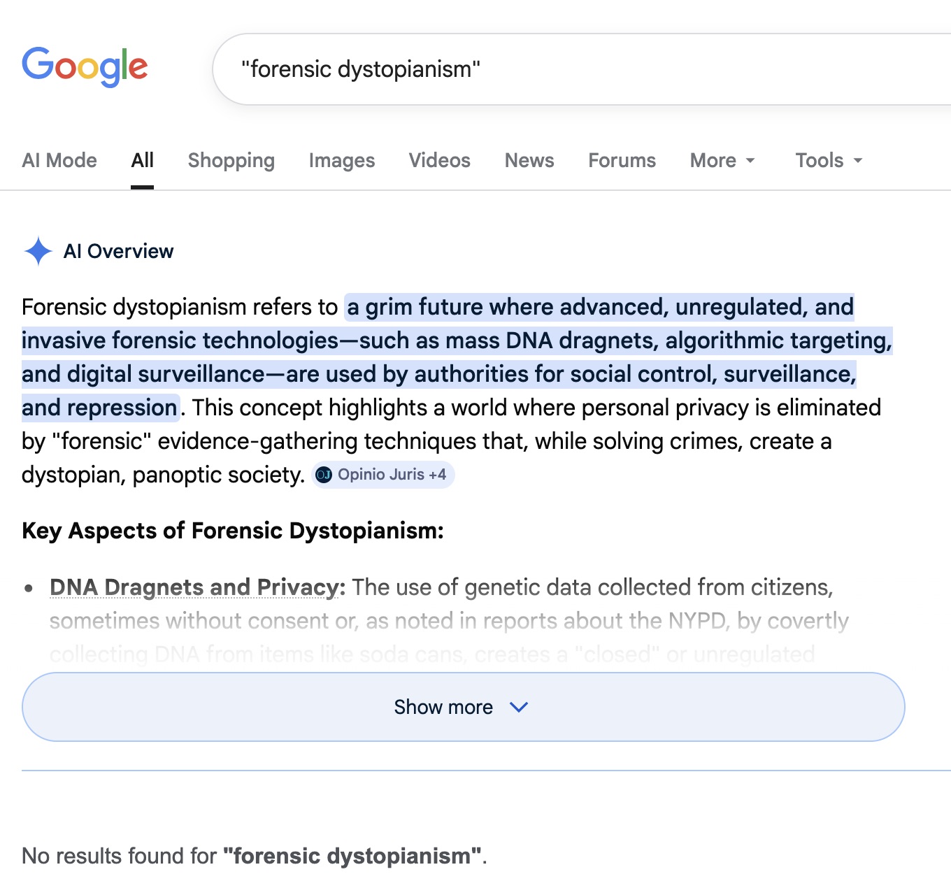 Another phrase I’m surprised hasn’t been thoroughly hashed out: “forensic dystopianism.” I’m not a fan of Substack at all, but so many people are; and I’ve wasted too much time on self-marginalizing high-minded refusals — so that’s the name I chose to dump my occasional thoughts over there.