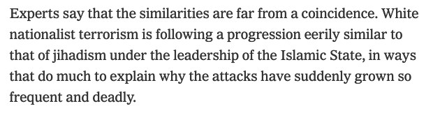 Conventional wisdom says that periods of political instability fuel popular interest in irrational ideas — conspiratorial thought, paranormal theories, etc — but that’s just a gloss. It sorta proposes a why but skips over how these tendencies disseminate, as if they were a vital force rather than the result of identifiable discursive habiits. This is an interesting example: the NYT was reluctant to plainly state as fact that whitist and jihadist terror are cut from the same cloth, so it tossed in “eerily” to mystify the relation.