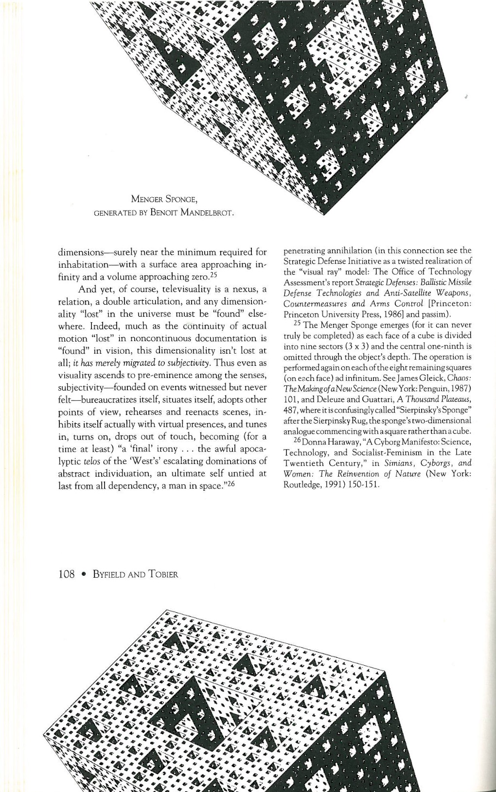 This systemic functioning is, in a phrase, a rudimentary “virtual reality” — that is, quite real but not actual. As such, it can be experienced only as a virtual image. And however mobile qua actor or qua audience this image may be, it nevertheless invests events, in all their fractality, integrity, continuity, dimensionality, and temporality, with a face. Thus, the politician, anticipating that millions will watch, censors himor herself in his or her present for the virtual multitudes apparent in a camera lens; and the viewers, knowing that he or she will have done so, assess in their present the virtual image of this past performance apparent on a television screen — all in all, a reciprocal certification of sorts.22 Alternatively, the unforeseen-not documented in proportion to the significance retrospectively invested in it — acquires only minimal facets: the Zapruder film of Kennedy’s assassination, the explosion of the space shuttle Challenger, and so on.23 Televisuality — the whole technology and all it encompasses — merely supersedes, collapses, subverts, and negates “substantive” oppositions such as cause / effect,24 time / space, mind / body, event / observer, and so on, not by exploring them in depth but by denying them their spatiotemporal fullness and ambiguity. The result is a faceted husk of a universe from which space and force are repeatedly, regressively elided: a Menger Sponge, if you will, a topological object occupying 2.768 dimensions surely near the minimum required for inhabitation — with a surface area approaching infinity and a volume approaching zero.25